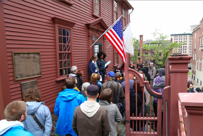 On May 6th and 7th, more than 80 people took part in a two hour walking tour of the College Hill neighborhood of Providence, and learned about its historic significance in the international and domestic slave trade. Participants came from as close as Benefit Street and as far away as Ghana and Chile. These multi-racial and multi-generational cadres of neighbors, friends, classmates and family members took a mile long hike through important though long obscured local history.