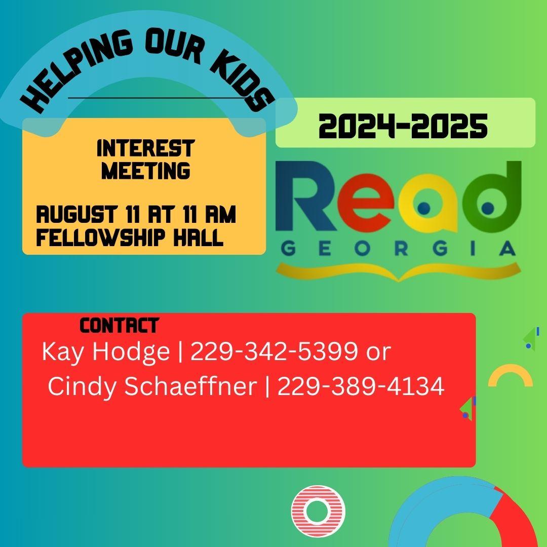Feel free to join us for an interest meeting on Sunday, August 11th at 11:00 am in the Fellowship Hall on the left side (screen side.) Contact Kay Hodge @ 229-942-5399 or Cindy Schaeffner @ 229-389-4134 for details.