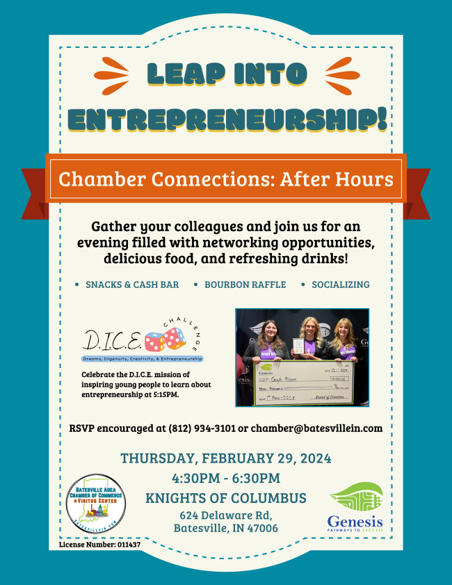 We are also excited to partner with Genesis: Pathways to Success for a Chamber Connections After Hours - Leap Into Entrepreneurship event. It will be on Thursday, February 29th from 4:30 pm to 6:30 pm. This event is a great networking opportunity, while enjoying snacks, and a cash bar. The highlight of the evening will be a special presentation by Genesis at 5:15 pm to celebrate the D.I.C.E Challenge mission of inspiring young people to learn about entrepreneurship. To plan accordingly, a RSVP is encouraged by calling the Chamber at 812-934-3101 or email chamber@batesvillein.com by Feb. 26th.