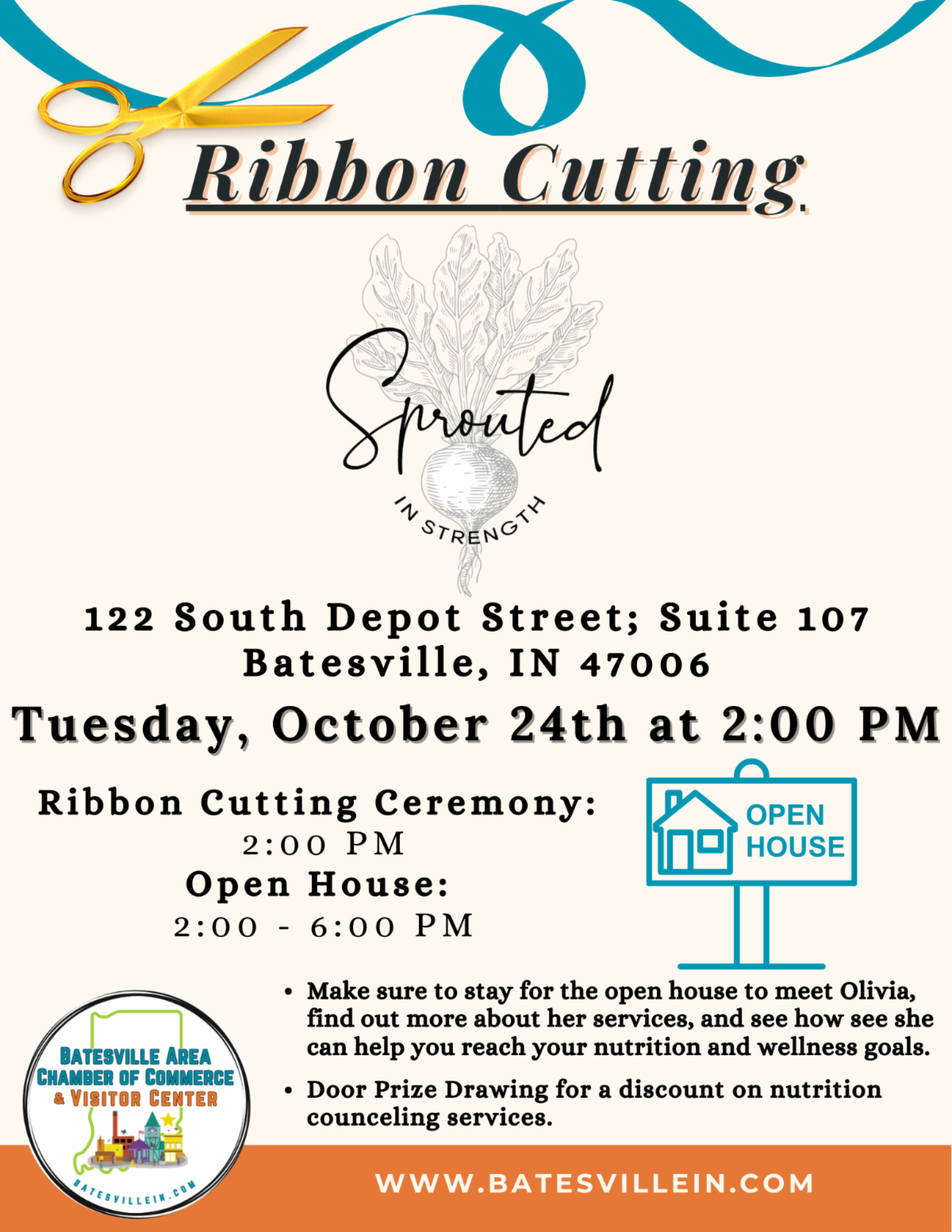 Join us for a Ribbon Cutting and Open House on Tuesday, October 24th at 2 pm for Sprouted in Strength (Olivia Fledderman) at her new location at 7 South Eastern Avenue, Batesville. Her mission is to provide you and our communities with the opportunity to learn how to promote overall wellness in an atmosphere that supports and encourages you to implement positive changes into your daily routine with hopes of preventing diseases and eliciting a healthier version of yourself and our communities alike. She also works with individuals, groups, organizations, and businesses as a dietitian consultant.