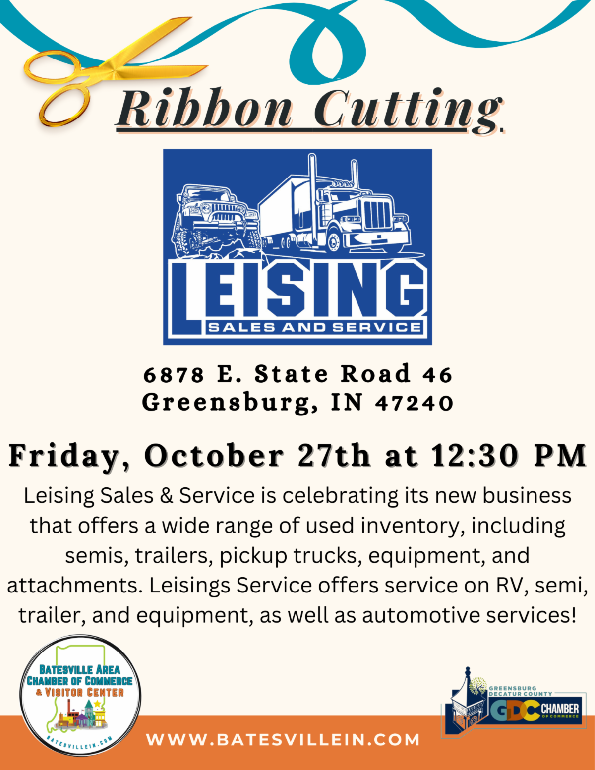 Please join us for a Ribbon Cutting on Friday, October 27th at 12:30 pm for Leising Sales & Service, a new business addition of Leising Excavating. They offer a wide range of used inventory, including semis, trailers, pickup trucks, equipment, and attachments. They also offer services on RV, semi, trailer, and equipment, as well as automotive services! Stop by and check out their gifts and apparel too at 6878 E. State Road 46, Greensburg.