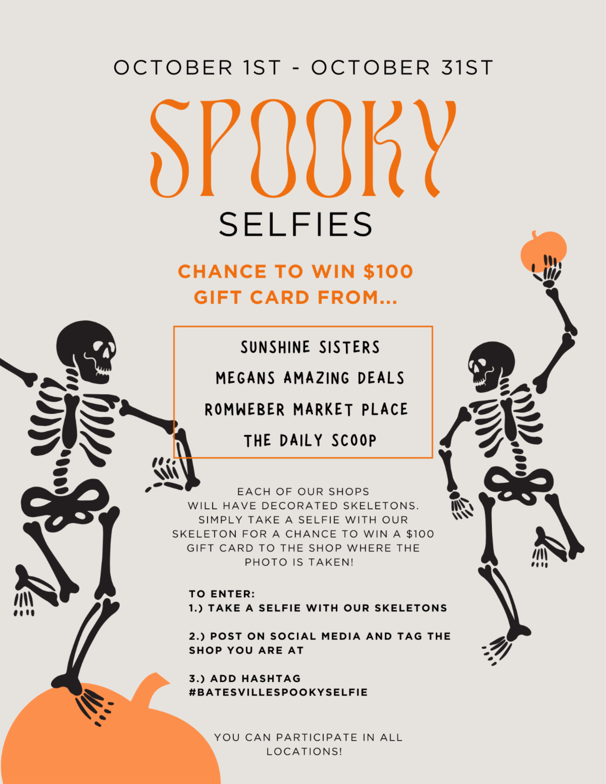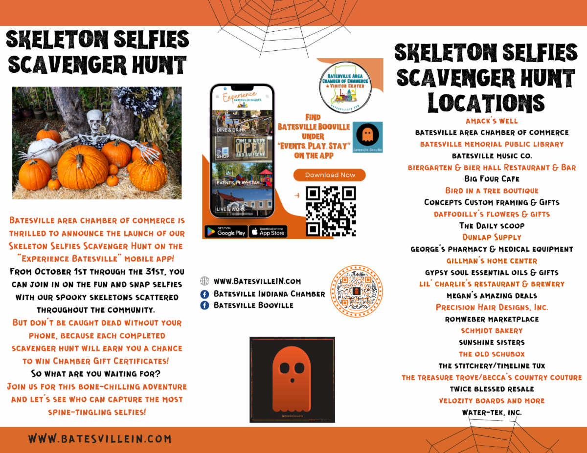 You still have time to join in on the fun by taking a selfie with skeletons and spooktacular specials all around town this month during the Batesville Booville campaign? Go to our mobile app, Experience Batesville, click Events, Play, Stay, and click on Batesville Booville. Enjoy all the great specials and discounts at participating businesses. There are 25 skeletons around town. Take a selfie with at least 15 of the skeletons and post to the app and also tag the business and the Chamber at #batesvilleindianachamber or #batesvillebooville.