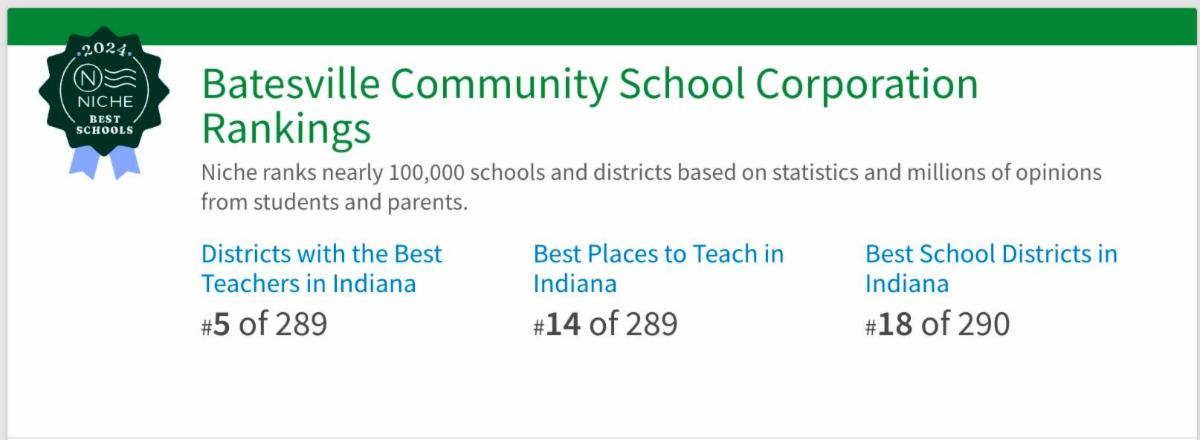 Congratulations to the Batesville Community School Corporation for being selected as one of the 2024 Best School Districts in Indiana. This recognition is a testament to the hard work and dedication of the teachers, staff, and students in the district. We are proud to have such a great community with outstanding schools. Congratulations to everyone in the Batesville Community School Corporation for this well-deserved honor. Keep up the excellent work! | |