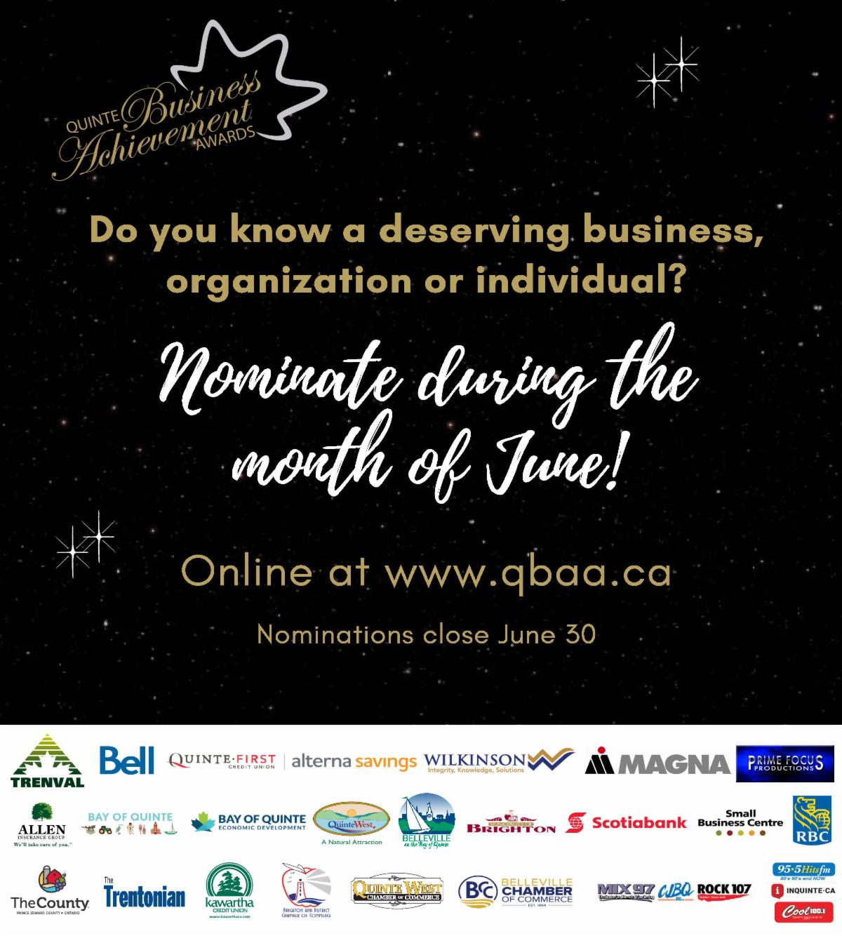 Also, the Quinte Business Achievement Award nomination portal is now open. We have had many members acknowledged through this program and I encourage you to nominate a business you believe has demonstrated excellence and achievement in their sector in some way this past year. There are also opportunities to nominate a Young Entrepreneur and Business Person of the Year... we could all use a boost, so please consider nominating a business this year. See below for the link to Nominate Now!