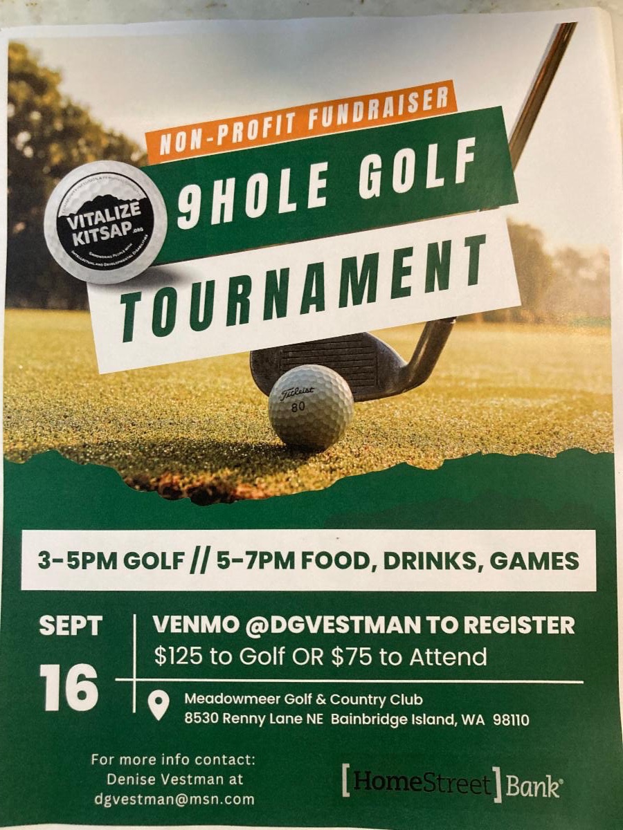 Support Vitalize Kitsap at their Golf Tournament at Meadowmeer Golf & Country Club. It is $145 to golf or $75 to attend and enjoy Food, Drinks, & Games.