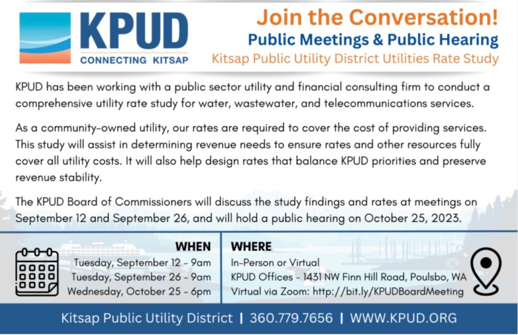 The KPUD (Kitsap Public Utility District) has been working with a public sector utility and financial consulting firm to conduct a new comprehensive utility rate for water, wastewater, and telecommunications services.