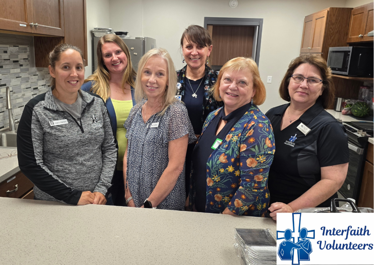Interfaith staff and board members (l-r) front row: Finance Coordinator Laura Hanson, Volunteer Coordinator Carol Jarrett, Board Member Maggie Rewald, Board Member Diane Aldach. Back row: Program Coordinator Bethany Sartor and Board Member Nicole Schweitzer. Staff not pictured include Time For You Coordinator Shawn Callisto and Time For You Support Staff Bev Zink | |