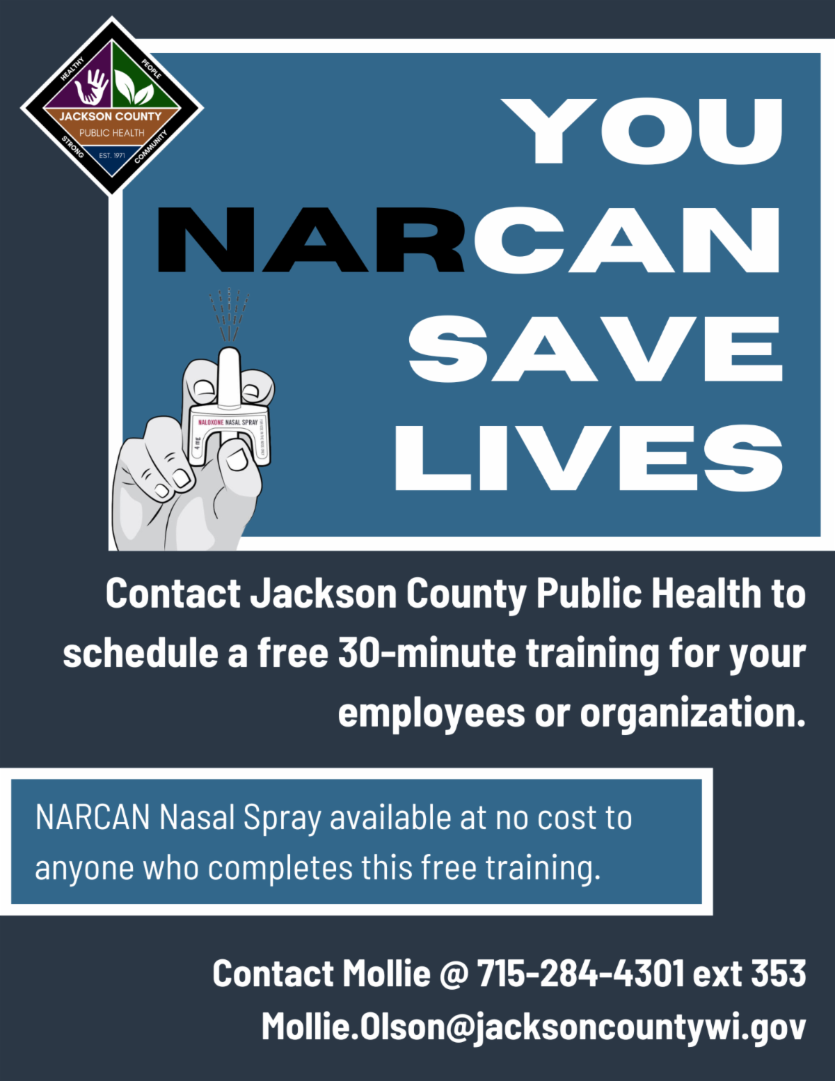 If you are interested in setting up a free 30-minute training for your business or organization, please contact Mollie with Jackson County Public Health at 715-284-4301 ext 353, or Mollie.Olson@jacksoncountywi.gov. Individuals wishing to receive the training are also able to set-up a one-on-one training at Jackson County DHHS.