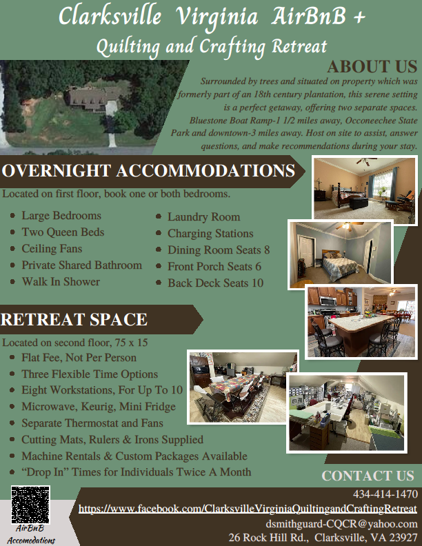 Clarksville Virginia Quilting and Crafting Retreat and AirBnB