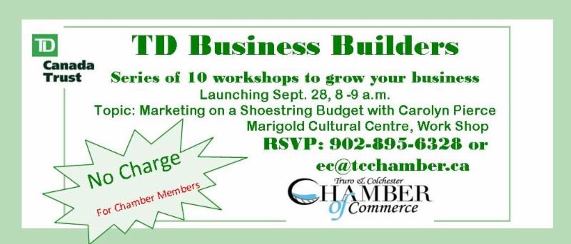 The Truro and Colchester Chamber of Commerce will be launching a new program on Sept. 28 - The TD Business Builder series. This series of 10 early morning workshops will provide Chamber members an opportunity to connect with an expert on a variety of topics providing information and tools to build their business. This program is sponsored by TD Canada Trust and is offered