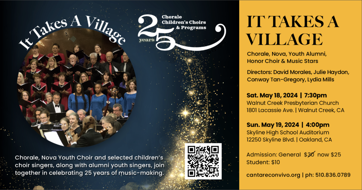 In our upcoming May concert series, It Takes a Village, several of our youth choirs along with 30 youth alumni will join with the Chorale for this special occasion. With Nova, Youth Honor Choir, youth alumni, and Music Stars choirs from Lincoln Elementary and Melrose Leadership Academy, we will bring 150 of our youth singers to Walnut Creek as well as Oakland. I want you to be there with us in cultivating your understanding and connection with these in Cantare’s family who continue to strengthen our community. Along with the Chorale, we will entertain you with a fabulous array of pieces and pay tribute to those who launched us and to all of you who have invested your time, presence and money in this facet of our mission.