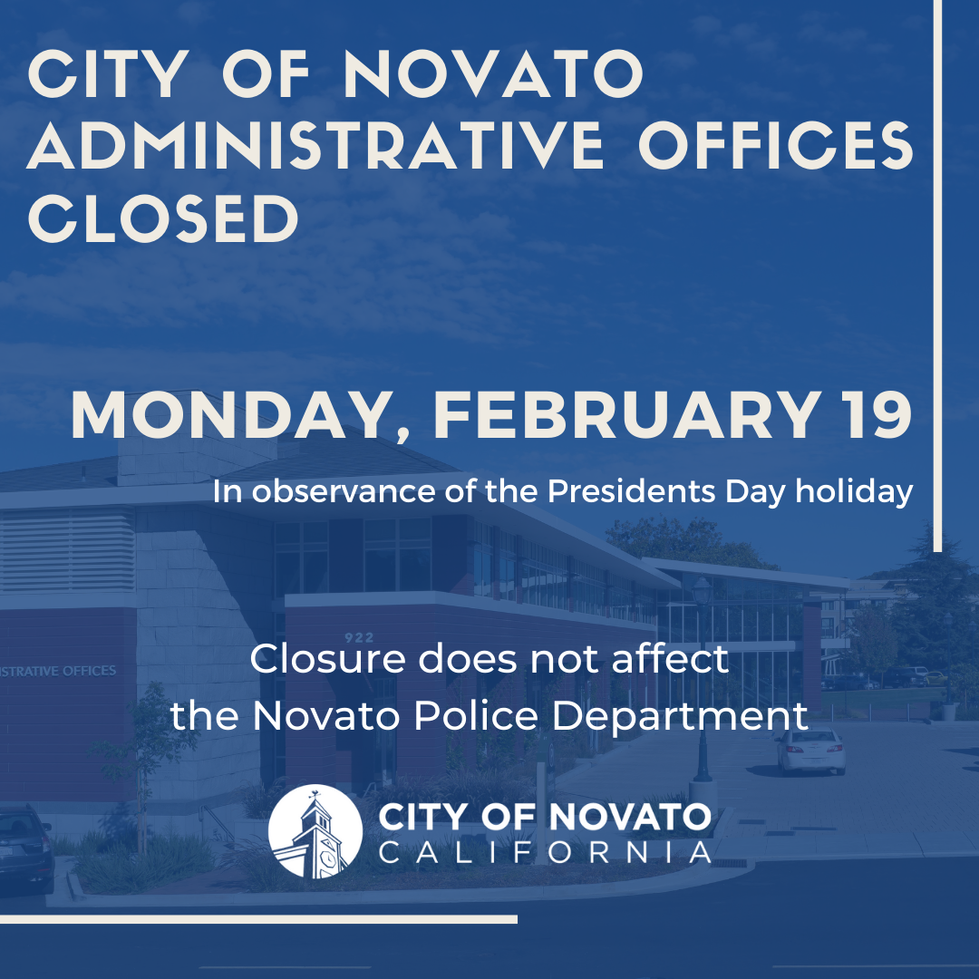The City of Novato Administrative Offices will be closed on Monday, February 19, in observance of the Presidents Day holiday.