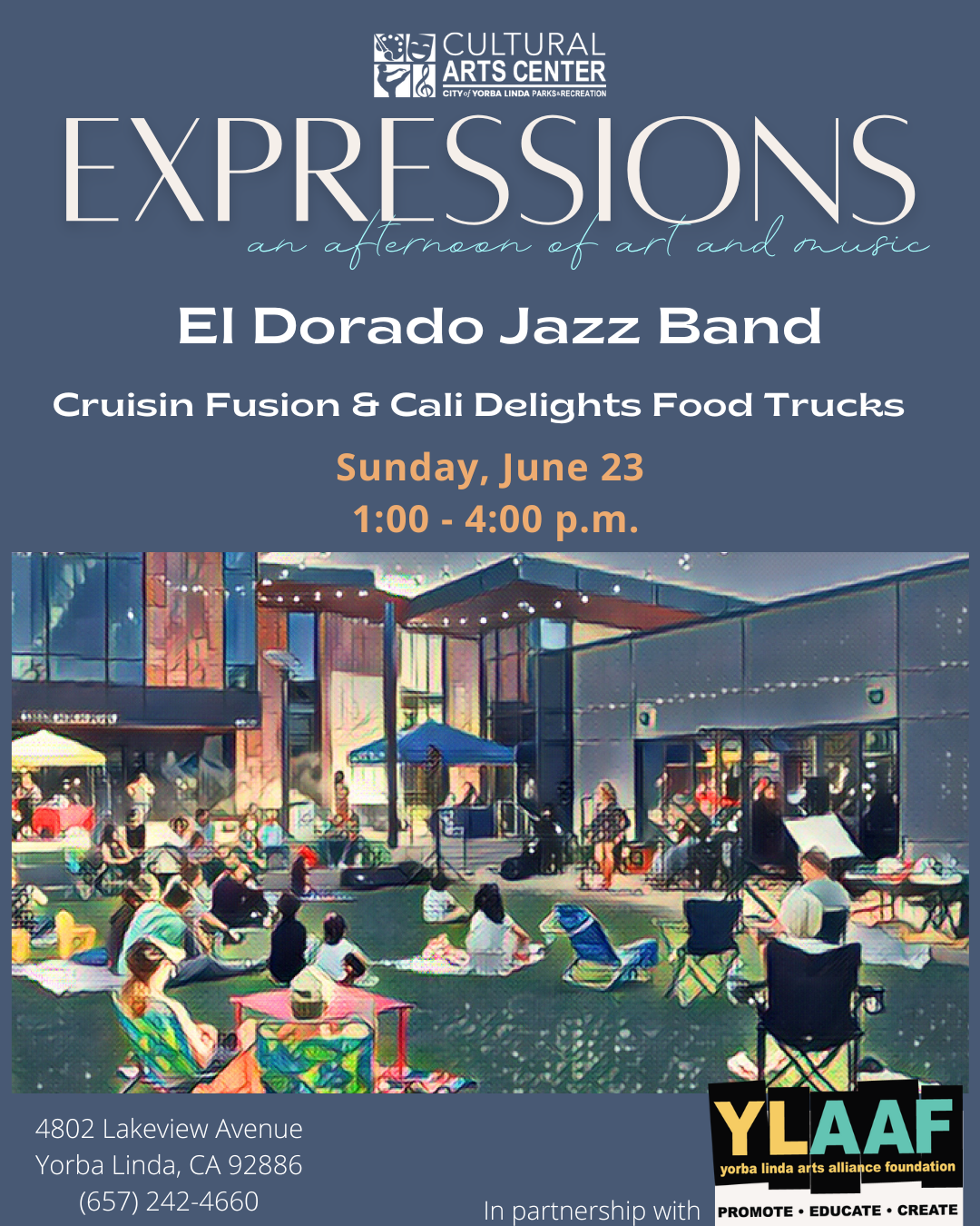 The Cultural Arts Center, in partnership with the Yorba Linda Arts Alliance Foundation, will host its final Expressions: An Afternoon of Music and Art Series on Sunday, June 23, from 1 to 4 p.m. The event will feature an outdoor concert by the El Dorado High School Jazz Band, local art vendors and demonstrations, and food trucks provided by Cruisin Fusion and Cali Delights. This event is free and open to all, and no registration is required! For more information, please visit the City's website or call 657-242-4660.