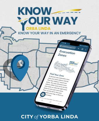 Wildfires and other emergencies can be chaotic and stressful, so planning ahead is important! Yorba Linda is prone to damaging wildfires and other disasters that could require evacuating your home with little or no warning. While the City of Yorba Linda and our public safety partners have planned and trained extensively, including creating evacuation zones, the City needs you to do your part too. Since residents play an essential role in their own protection, the City encourages everyone to "KNOW YOUR WAY" and identify all the ways to exit your neighborhood. Since there is no one way to safety that fits all disaster scenarios, knowing multiple routes to get out of your community is critical.
