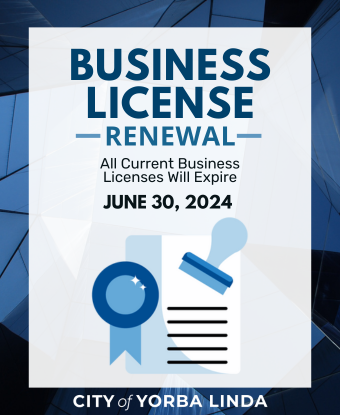 Attention Yorba Linda Businesses! It's that time of year again to renew your business license! To keep your business compliant with City standards, renew your license by Sunday, June 30, 2024. Renewing on time avoids extra fees and keeps your business running smoothly. You can pay your renewal online, by mail, or in person. Let's keep Yorba Linda's business spirit strong! For inquiries or questions, please contact the Business License staff at 714-961-7145.