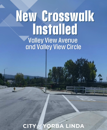 The City is excited to unveil the installation of a brand-new crosswalk on the western leg of Valley View Avenue and Valley View Circle. This freshly painted, bright white crosswalk not only marks a safe spot for pedestrians to cross but also serves as a clear reminder to motorists making northbound left and southbound right turns to yield to those on foot. The City remains steadfastly dedicated to enhancing safety measures and preserving the exceptional quality of life in Yorba Linda. We hope you enjoy the added convenience of the new crosswalk!
