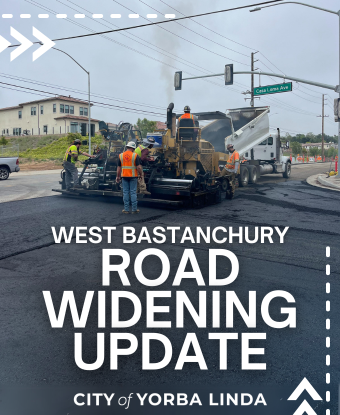 The wait is almost over, Yorba Linda! The West Bastanchury Road Widening project is nearing completion, with just final roadway paving, landscaping, irrigation, and traffic signal work remaining. During the paving operation, temporary closures at Casa Loma Avenue and Eureka Avenue will be in effect, but detours will be clearly marked to guide traffic around. The entire project is slated for completion by mid-summer 2024. The City sincerely appreciates your patience as we finalize these important improvements.