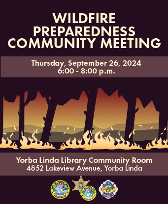 The City of Yorba Linda invites you to attend a Wildfire Preparedness Community Meeting on Thursday, September 26, from 6 p.m. to 8 p.m. at the Yorba Linda Public Library. Key topics will include personal and home disaster preparation, “Know Your Way” evacuation zones and neighborhood exits, and an overview of our local agencies’ collective planning efforts. Join us to learn what to do and what to expect when a wildfire threatens Yorba Linda.