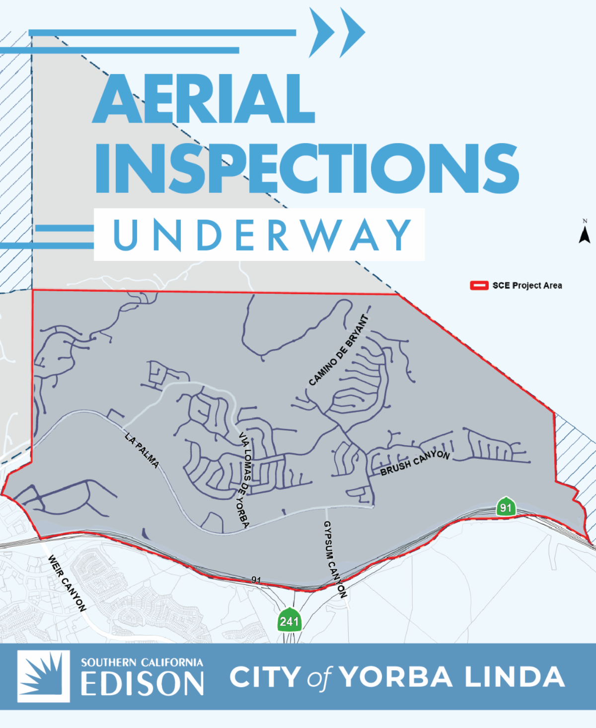 Starting Monday, August 12, continuing through Friday, September 6, Southern California Edison (SCE) will be conducting aerial inspections in Yorba Linda (Star Rock Circuit) using drones and helicopters as part of their wildfire prevention and mitigation program. These inspections will ensure electrical equipment on poles and towers are operating safely and that lines are clear to reduce the threat of wildfires. During this time, you may hear or see helicopters and drones, but please don't be alarmed. The inspections will take approximately 30 to 60 minutes per pole or tower. Please view the map of the impacted areas. If you have any questions, please contact SCE at 800-655-4555.