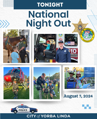 Tonight, Yorba Linda Police Services is hosting its annual National Night Out event at the Yorba Linda Community Center from 6 to 8 p.m. National Night Out is an annual community-building campaign that promotes police-community partnerships and neighborhood camaraderie. This event, celebrated by millions nationwide, provides a great opportunity to educate the public about the work of our public safety partners. Attendees will have the opportunity to observe a K9 demonstration and a helicopter landing, meet our City’s public safety partners and Mounted Enforcement Unit, explore interactive displays like Orange County Fire Authority's fire truck, and learn about important community resources. We hope to see you there!