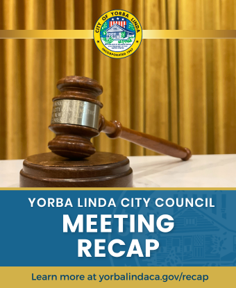 Want to learn more about the decisions and actions of the Yorba Linda City Council? The latest City Council meeting recap is now available online. These recaps briefly summarize the City Council's activities until the official minutes are adopted (generally at the next meeting). In addition, City Council Meeting agendas and minutes from previous meetings are available on the Agendas and Minutes page on the City's website.