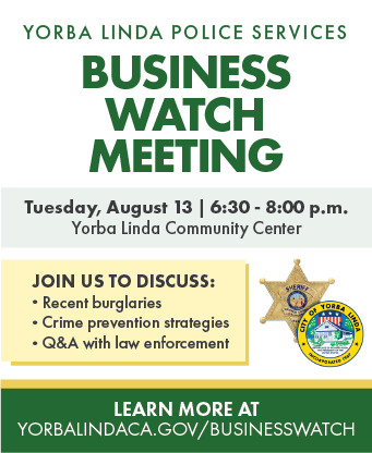 Yorba Linda Police Services will host a Business Watch Meeting for Yorba Linda businesses on Tuesday, August 13, from 6:30 to 8:00 p.m. at the Yorba Linda Community Center.