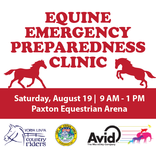 The City of Yorba, in coordination with the Yorba Linda Country Riders and Avid Identification Systems, is hosting an Equine Emergency Preparedness Clinic on Saturday, August 19, from 9 a.m. to 1 p.m. at the Phillip S. Paxton Equestrian Center. Come learn ways to prepare you and your horse for an emergency or natural disaster. Services and resources that will be offered include: