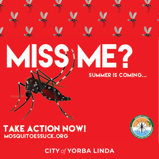 The Orange County Mosquito and Vector Control District and the City of Yorba Linda remind residents to take an active role in mosquito control by regularly inspecting their property for any stagnant water where mosquitoes can lay eggs. Mosquitoes can complete their life cycle from egg to adult in about a week and only need a body of water the size of a bottle cap to develop. Vector Control would like to remind you to tip, toss, and take action by doing the following: