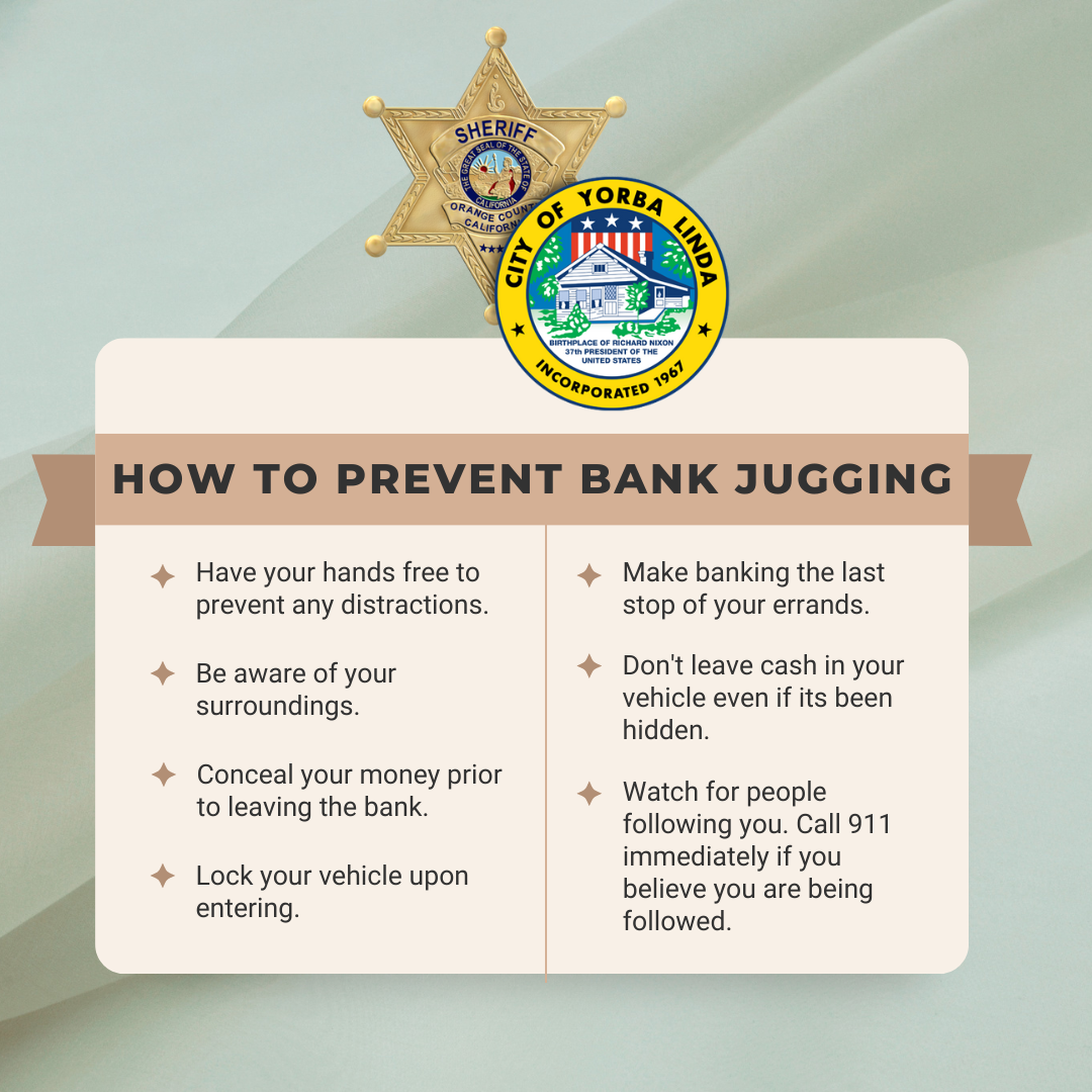 Yorba Linda Police Services encourages residents to be vigilant and discrete when making large withdrawals at banks or ATMs. Don’t openly carry coin boxes, bank bags, or envelopes. While there haven’t been any recently reported incidences of bank jugging in Yorba Linda, it is a crime that has occurred here in the past. If you notice any suspicious activity or behavior, call the 24-hour non-emergency line at 714-647-7000 and select the option for Sheriff’s Dispatch. If you believe you are being followed or need to report a crime in progress, dial 911.
