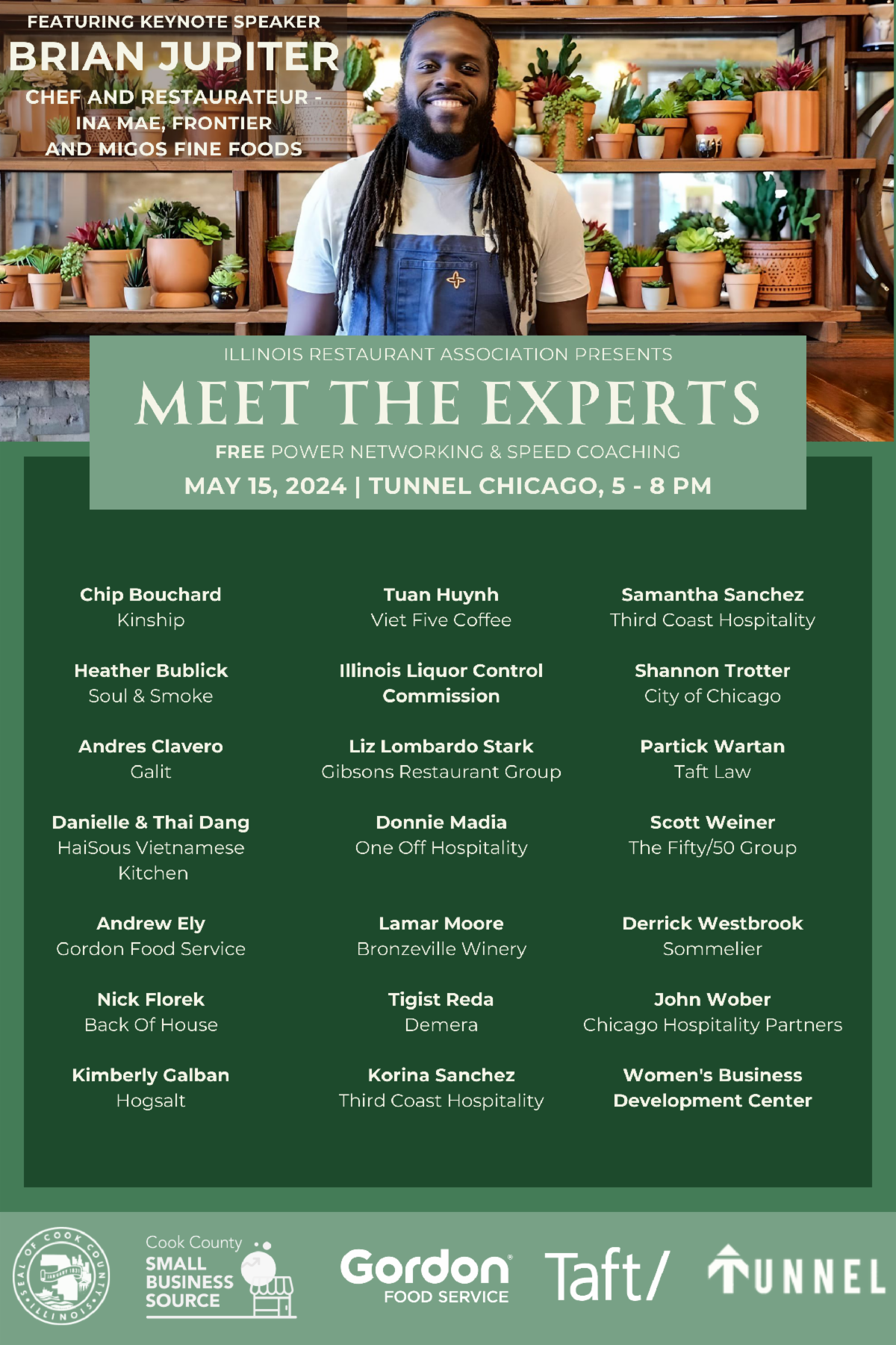 Meet the Experts 2024 will be May 15 from 5-8pm at Tree House Chicago, 149 W. Kinzie St. Thank you to our sponsors Cook County Small Business Source, GFS, Taft Law, and Tree House Chicago.