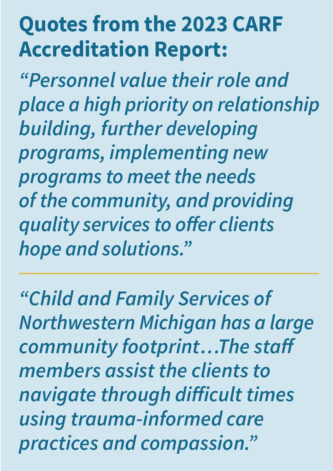 Kudos to all CFS staff members who work so hard to establish and continue internationally-recognized best practices at our agency, and to Kim Whitley, our Child Welfare Compliance Manager, who corralled the reams of information needed. While it is a thrill to get such an honor, the true merit of CARF accreditation is the assurance that we at CFS are doing our best to reach our ultimate goal—serving our clients in the best manner possible.