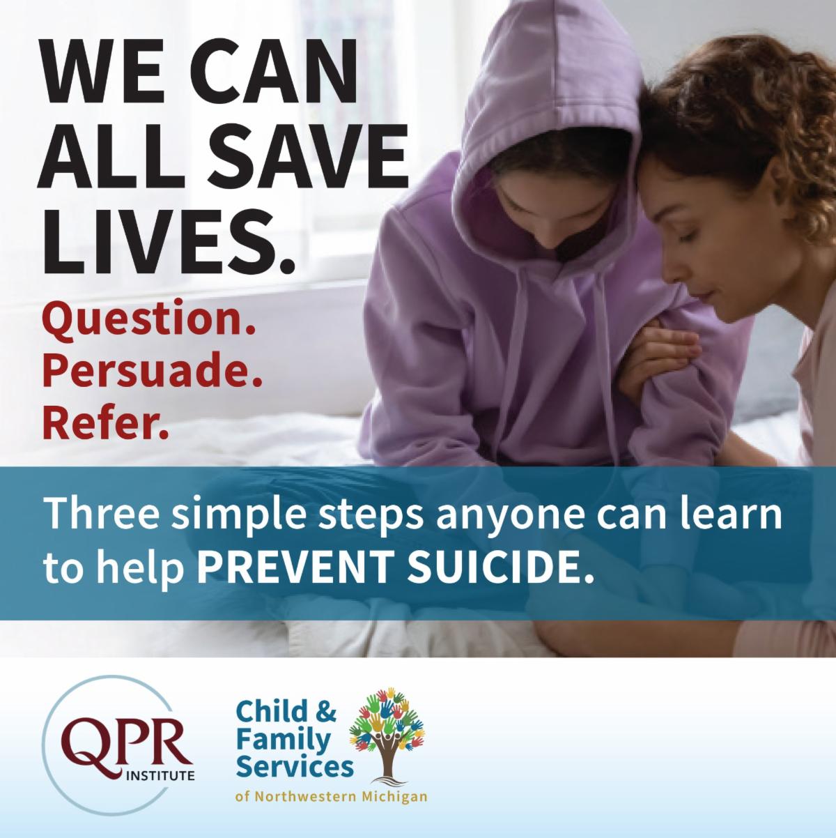 The QPR mission is to reduce suicidal behaviors and save lives by providing innovative, practical and proven suicide prevention training. The signs of crisis are all around us. This quality education can make a positive difference in the life of someone struggling.