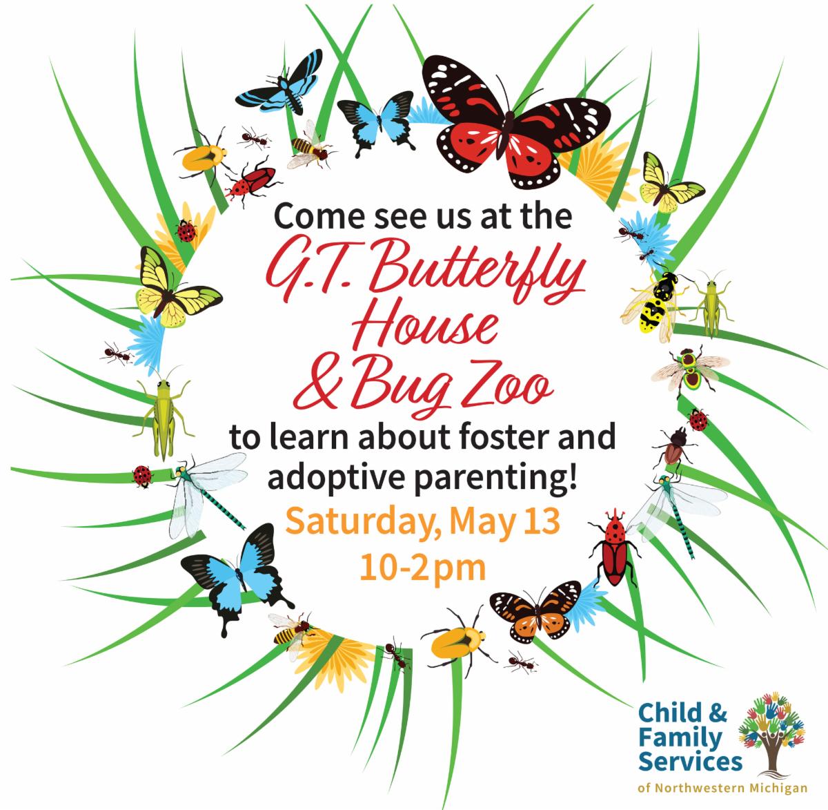 Come see us at G.T. Butterfly House & Bug Zoo in Williamsburg. It's a super-fun place to visit, and while you are there, stop and see us at our information table to learn more about foster and adoptive parenting and all things CFS! Free ice cream ticket to those that stop by our table and chat with us! Click for more information.