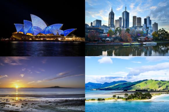 Sydney, Australia ● Melbourne, Australia ● Fiordland National Park, New Zealand ● Dunedin, Port Chalmers, New Zealand ● Akaroa, New Zealand ● Wellington, New Zealand ● Bay of Islands, Russell,