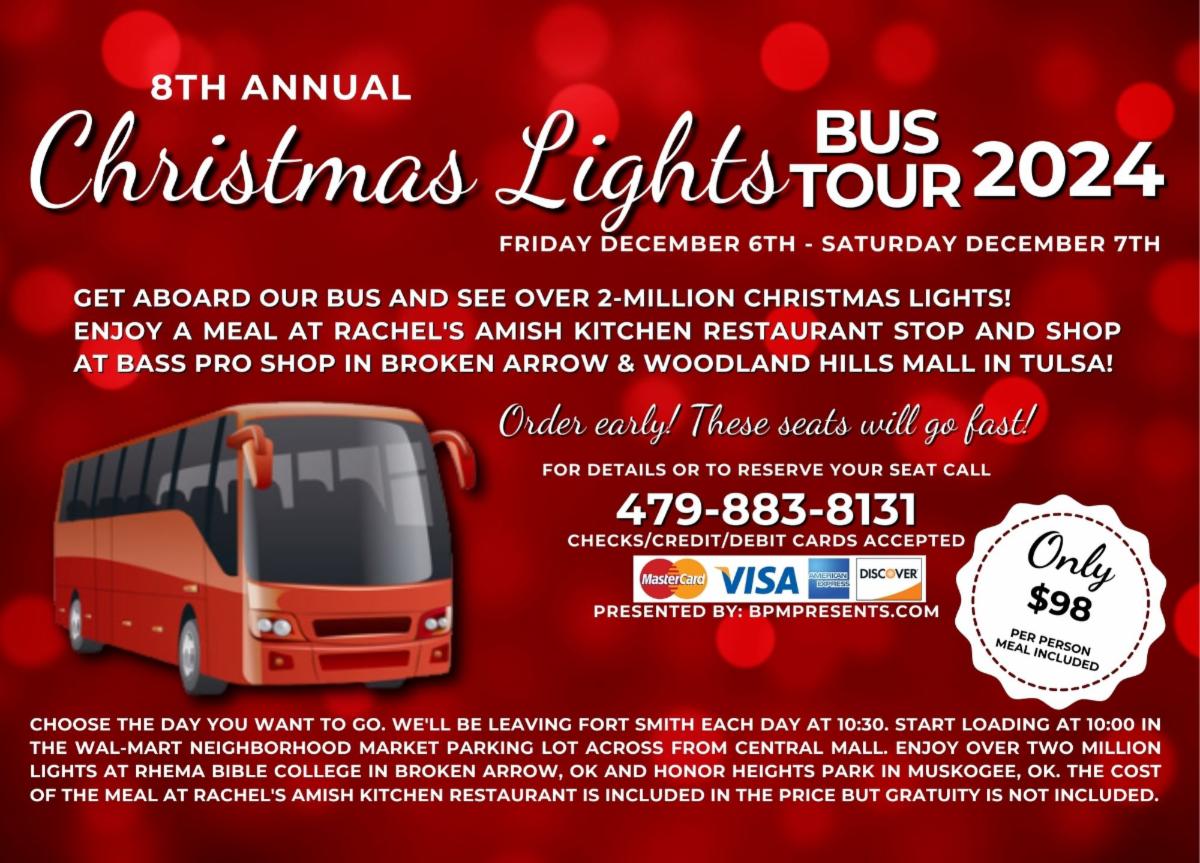 Taking reservation NOW for our Christmas lights bus tour 2024. See over 2-million lights at Rhema Bible College in Broken Arrow and Honor Heights Park in Muskogee. Leave each morning from Ft.Smith and return that evening. Cost is only $98 per person meal is included at the Amish Restaurant. To reserve your seats call today before they are all gone. Call (479) 883-8131