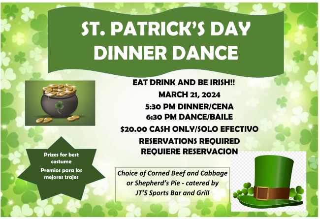 Get into the spirit of St. Patrick's Day at a “Pot O’Gold Dinner Dance on Thursday, March 21, 2024. Dinner begins at 5:30 pm and reservations are required. The cost is $20 per person, cash only. The Dance starts at 6:30 pm. For more information, please call the the Carl Shechter Southwest Focal Point Community Center at 954-450-6888. | | |