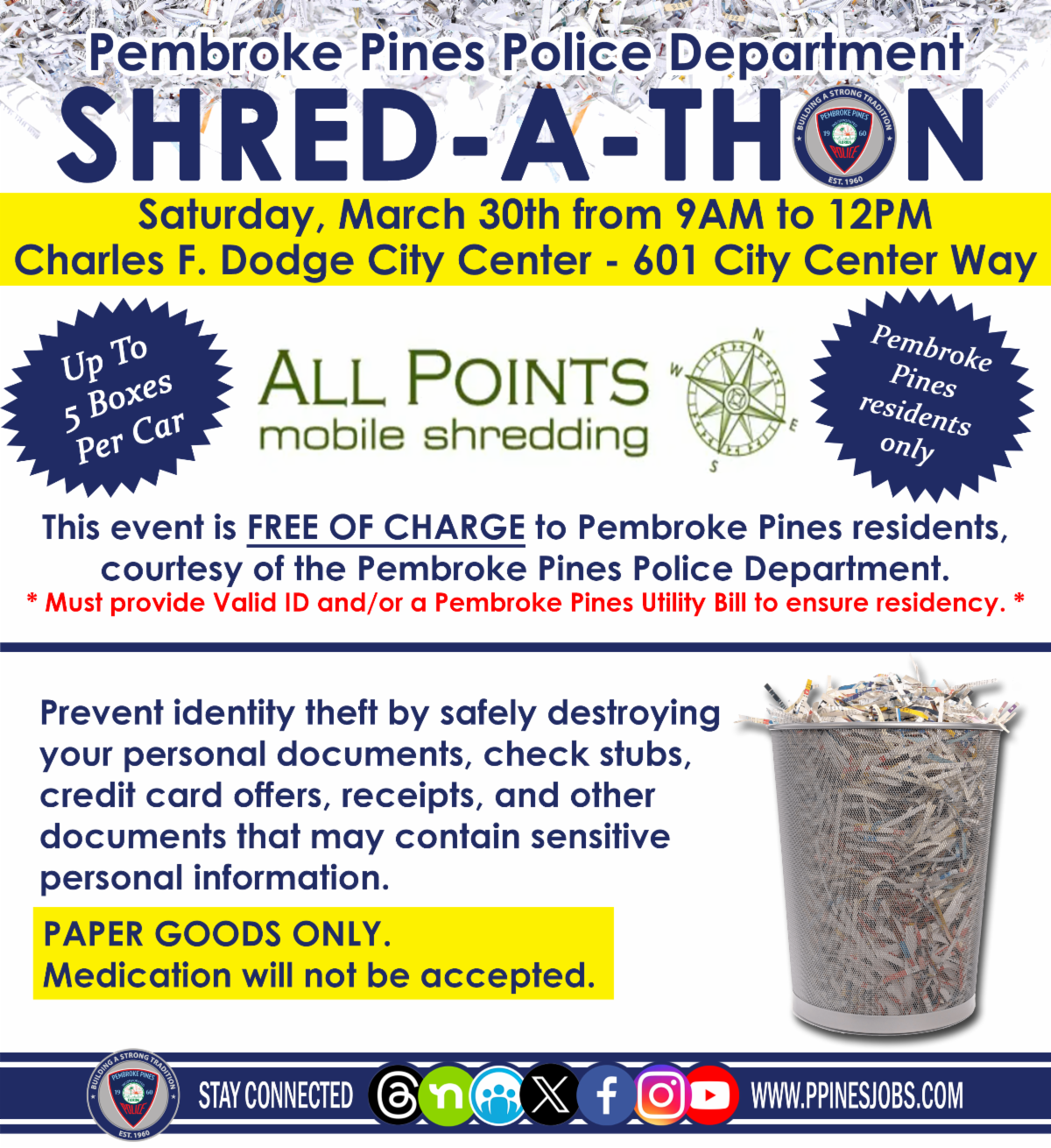 Household Hazardous Waste -- A Household Hazardous Waste Disposal drop off will be held on Saturday, March 9, 2024 from 8 am to 2 pm at 13975 Pembroke Rd. RESIDENTS MUST BRING PROOF OF PEMBROKE PINES RESIDENCY TO USE DROP OFF SERVICES. Please see website for list of items that can and cannot be disposed of.