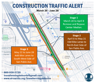 Construction has started on San Pablo Avenue for the El Cerrito Del Norte Transit-Oriented Development (TOD) Complete Streets Project. Traffic may be impacted from March 20 to June 28 during the first 3 stages of construction. Please exercise caution in this area, for the safety of other drivers, pedestrians, bicyclists, and the construction crews.