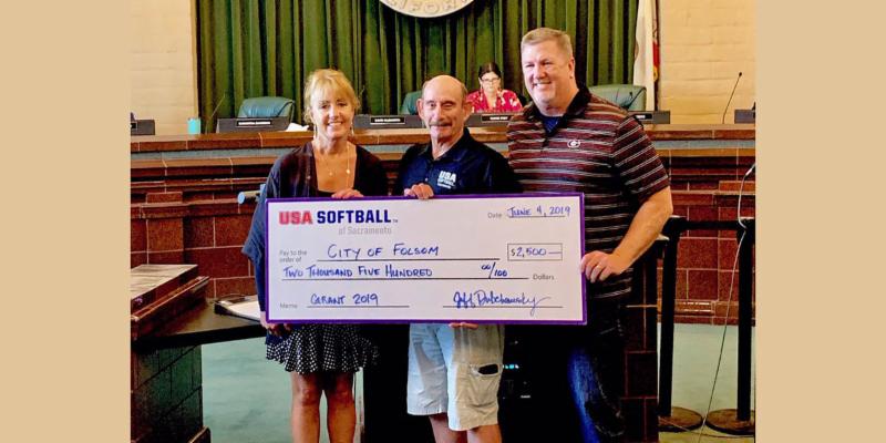 USA Softball of Sacramento Commissioner Jeff Dubchansky presented a $2,500 check at the June 4 Parks & Recreation Commission meeting. The grant money will help fund renovations of the softball field backstops at Lembi Park in the fall.