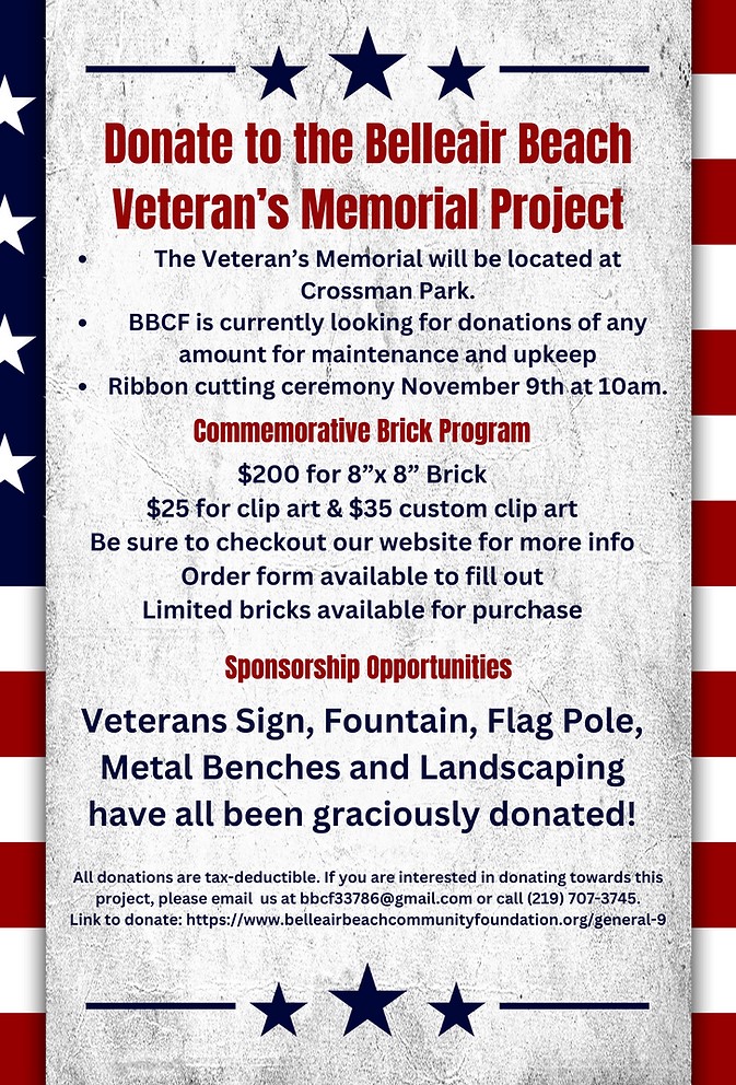 The Belleair Beach Community Foundation (BBCF) addresses the needs of our beach community and its residents. The BBCF is currently raising funds for a Veterans Memorial at Crossman Park, located at the intersection of Gulf Blvd and Causeway Blvd. For more information, or to donate, please click here. A ribbon cutting ceremony featuring Major General (retired) Charles W. Whittington, Jr. will be held on November 9th at 10:00am.