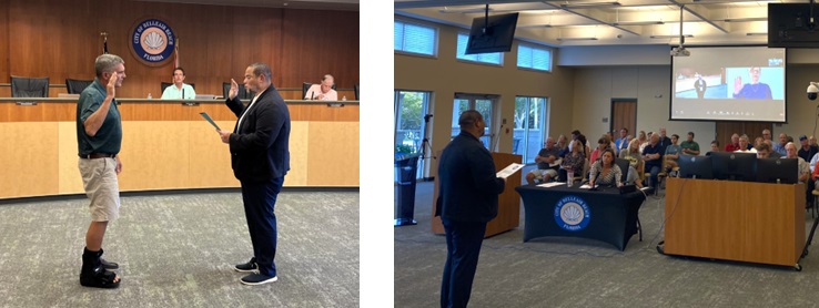 Incumbent council members Frank Bankard (left) and Kimberly Shaw Elliott (right) were sworn in to new terms on City Council at the April 8, 2024 City Council meeting. With the recent changes to the City Charter, they will both serve until November 2028.