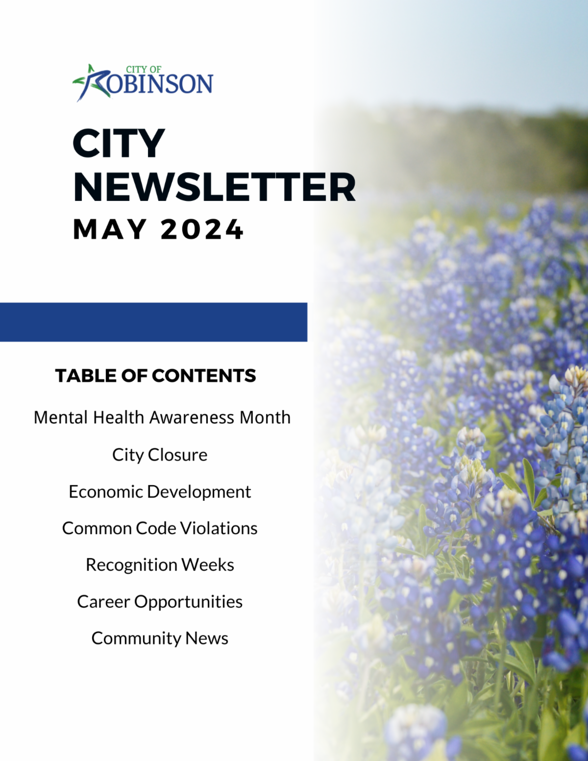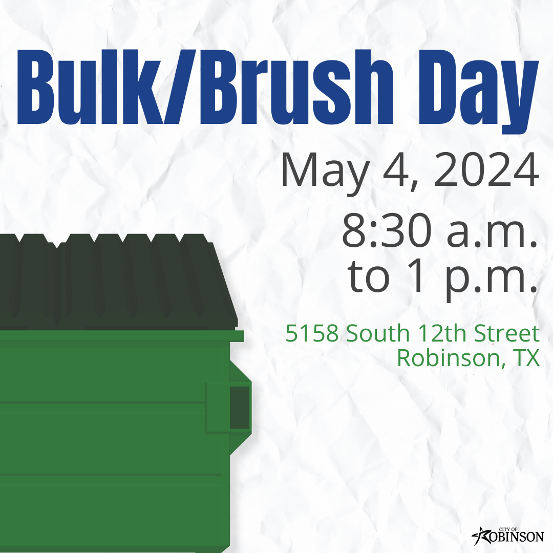 Bulk/Brush Day is May 4th from 8:30 a.m. to 1 p.m. at 5158 South 12th Street, Robinson, TX. City staff will NOT be available to help place bulk items in the containers so make sure to bring enough help to get items in the 40-yard roll-off.