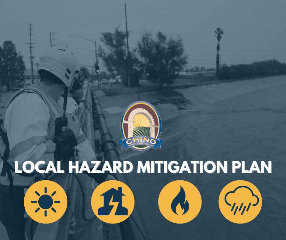 Local Hazard Mitigation Plans are guidelines that serve as roadmaps for communities like Chino to reduce adverse impacts from natural and human-caused disasters or hazards. Chino’s Plan will outline actions and steps that the City can take to reduce negative impacts on residents, businesses, and the community at large.