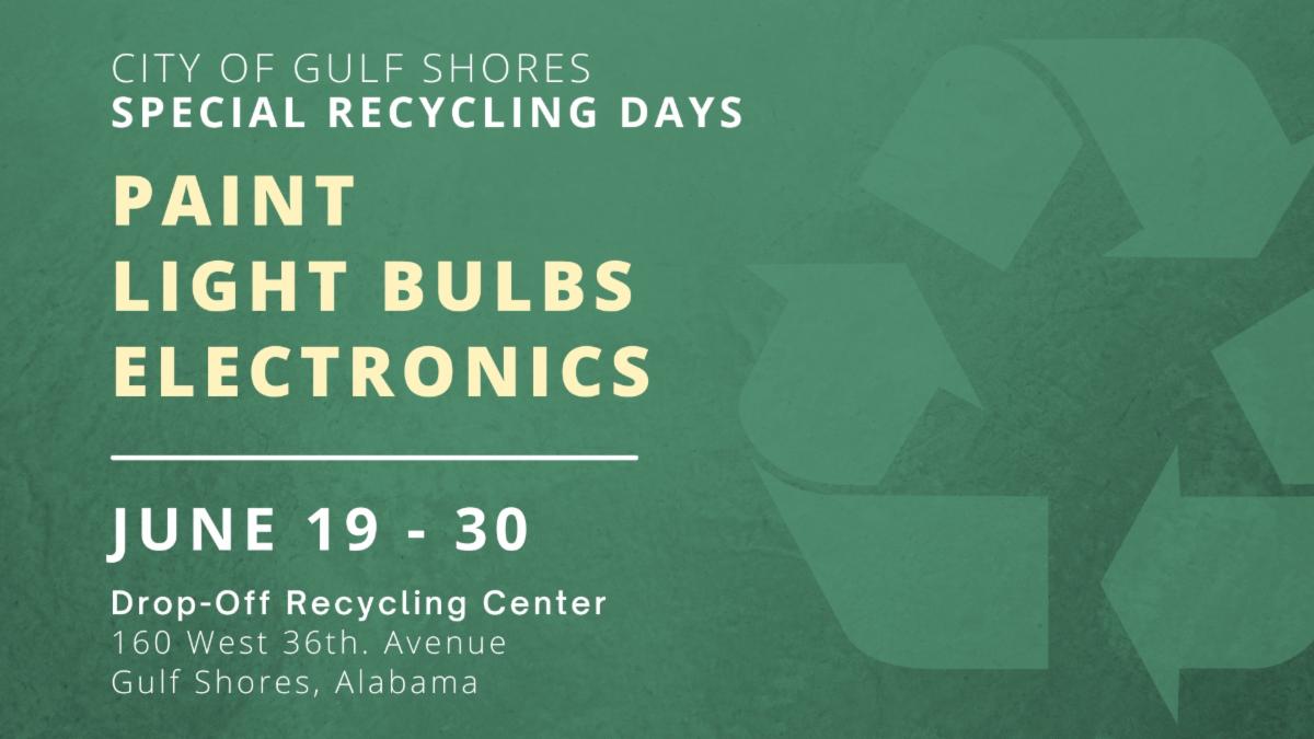 The City of Gulf Shores will host a Special Recycling Drive from June 19-30. During this time, the public can drop off items that are not normally accepted at the Drop Off Recycling Center.