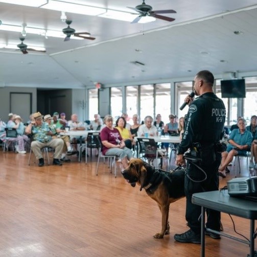 Chief Pust also attended a community meeting at The Lakes at Hemet West to present the City’s efforts to enhance safety and security efforts as developed in the Safe and Clean Streets Initiative. K-9 Duke and his partner Officer Tabor joined Chief Pust at this event and spoke about the Hemet Police Department’s K-9 program and the benefits this resource brings to the city.