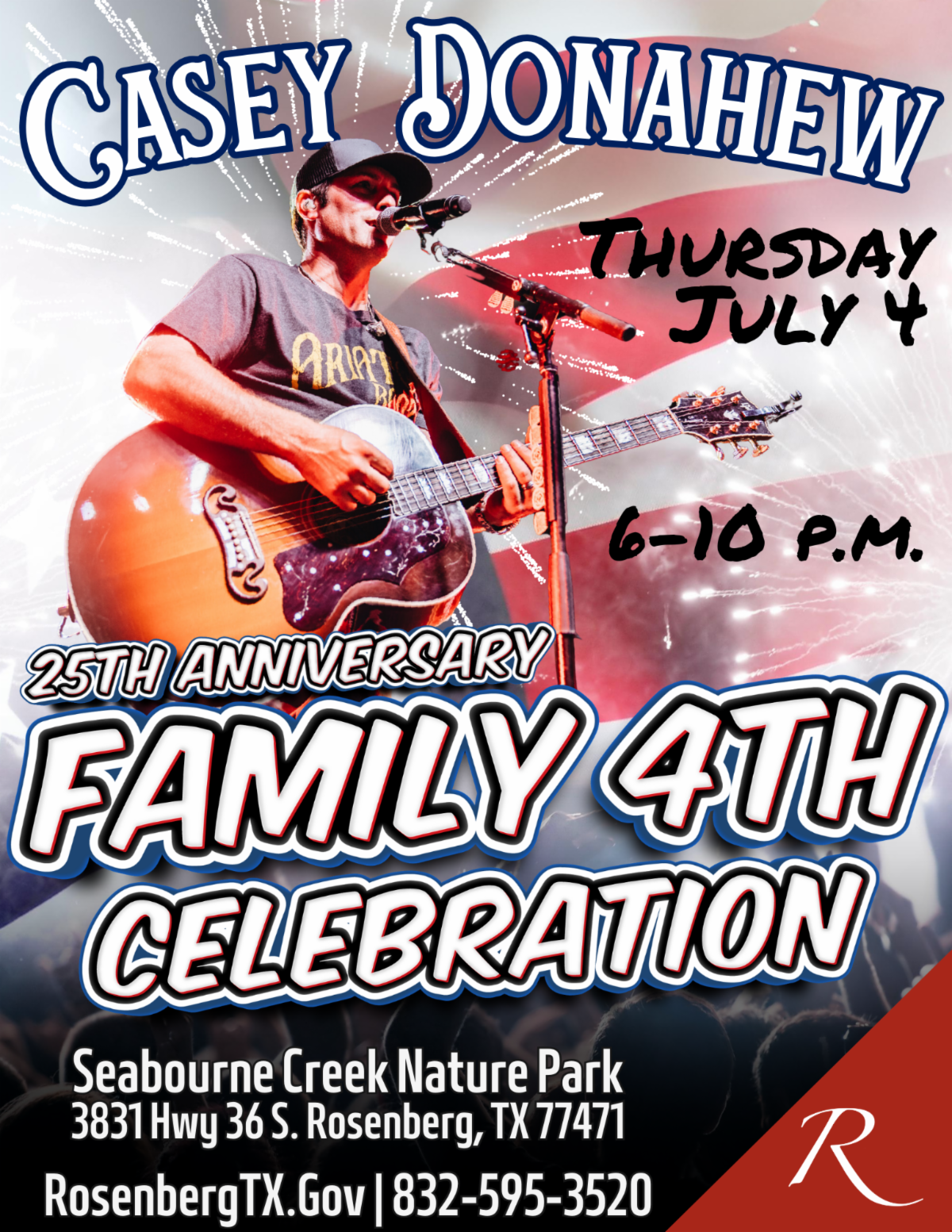 Get ready for the biggest July 4th celebration in town! The city of Rosenberg invites you to join us in commemorating the special 25th anniversary of the Family 4th Celebration on Thursday, July 4, from 6 to 10 p.m. at Seabourne Creek Nature Park (3831 Highway 36 S). The event is free and open to the public.