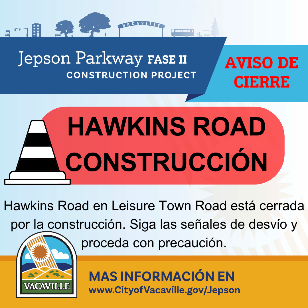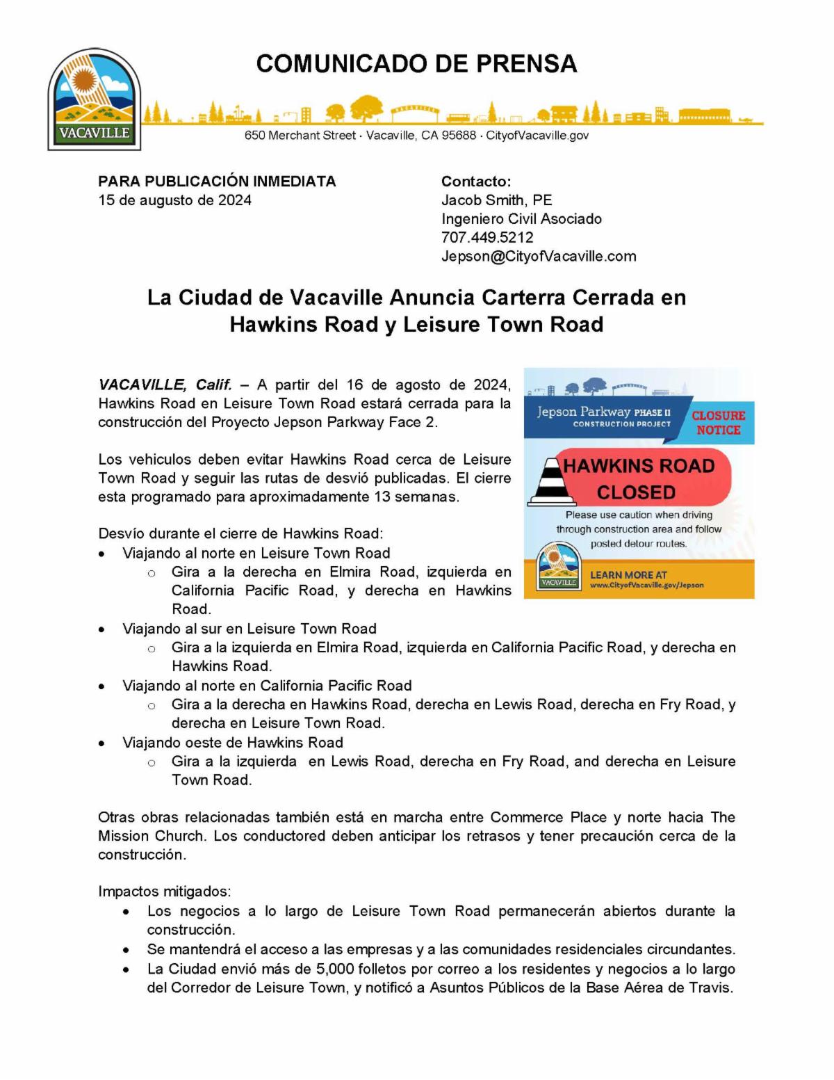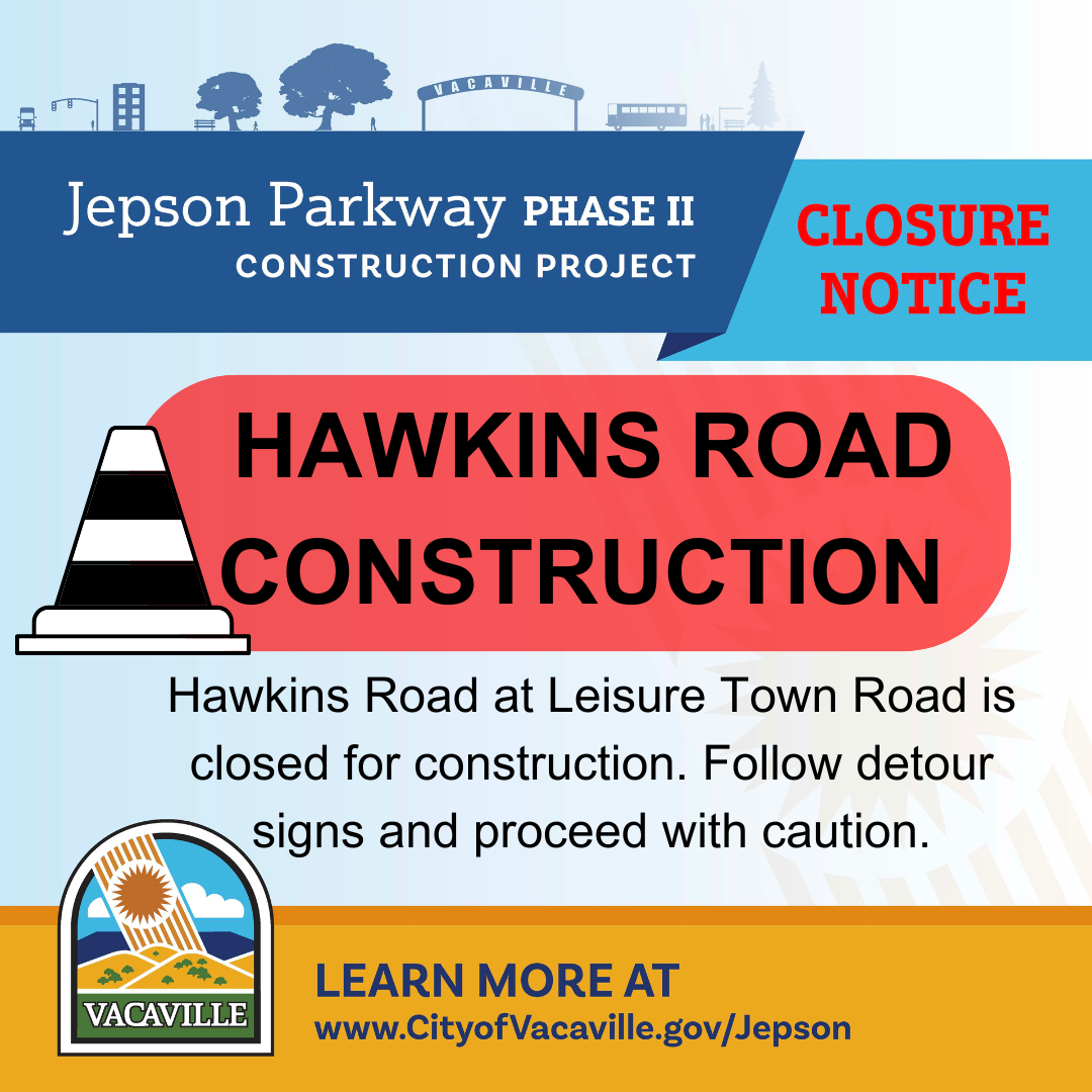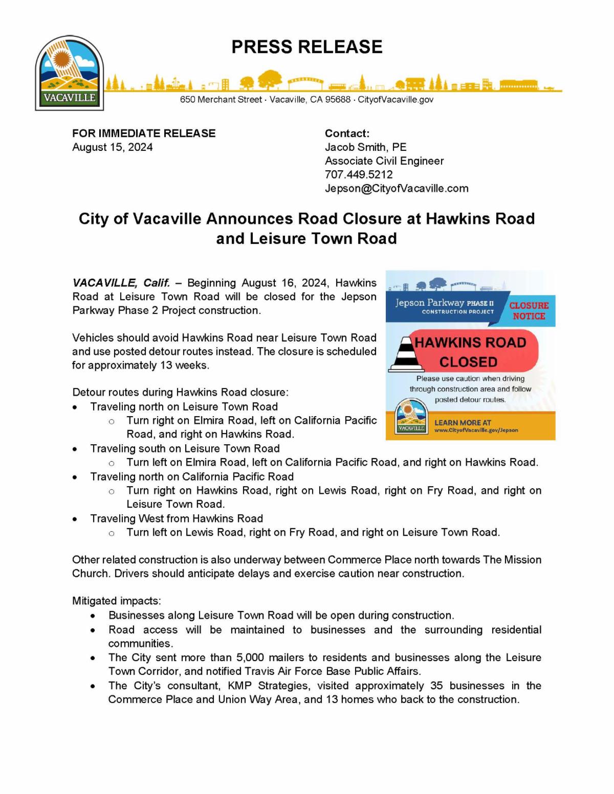 VACAVILLE, Calif. – Beginning August 16, 2024, Hawkins Road at Leisure Town Road will be closed for the Jepson Parkway Phase 2 Project construction.