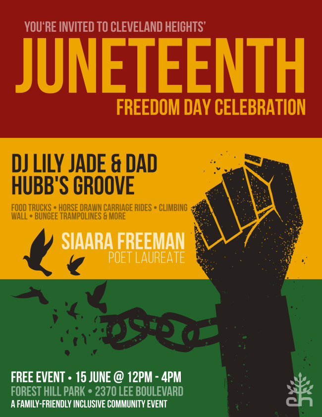 Cleveland Heights City Hall and the Community Center will be closed on Wednesday, June 19 in observance of Juneteenth.