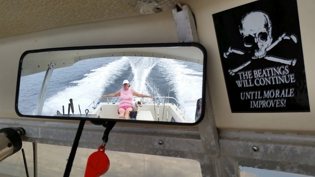 Dollie Ledford, aboard the "Sleepy Crew" ship, said she had the best seat accompanied with her two dogs!