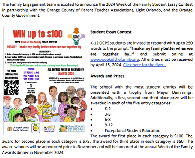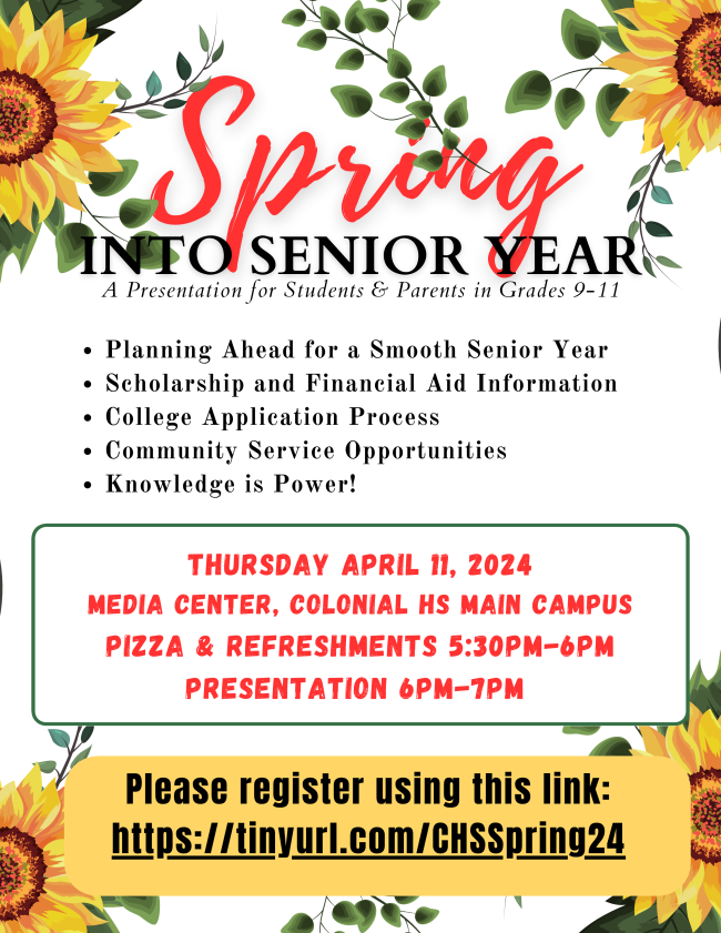 Parents, I realize that we are all continually receiving surveys from various businesses via email and text throughout the year. However, our 2024 Family Survey is coming down next Friday, April 12 and it is very different from all these others you see. For one thing, we actually act upon these surveys. Colonial's entire leadership team closely studies the results that become the basis for our school improvement plan which we begin on rather quickly. And secondly, we share our progress vs. the Family Survey recommendations with the community during our ongoing PTSA/SAC meetings. Please -- if you have a student at Colonial, kindly make a short time investment and let us know what you think about our school today while you are reading this issue. Your help before Friday, April 12 is greatly appreciated.